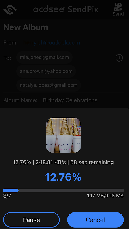 Mit ACDSee SendPix ist das Senden von Medien kostenlos und einfach. Öffnen Sie die App und hängen Sie die Medien an, die Sie teilen möchten, geben Sie die E-Mail-Adressen ein, an die Sie senden möchten, fügen Sie einen Albumnamen und eine Nachricht hinzu und senden Sie! Die Empfänger erhalten das Album fast sofort!