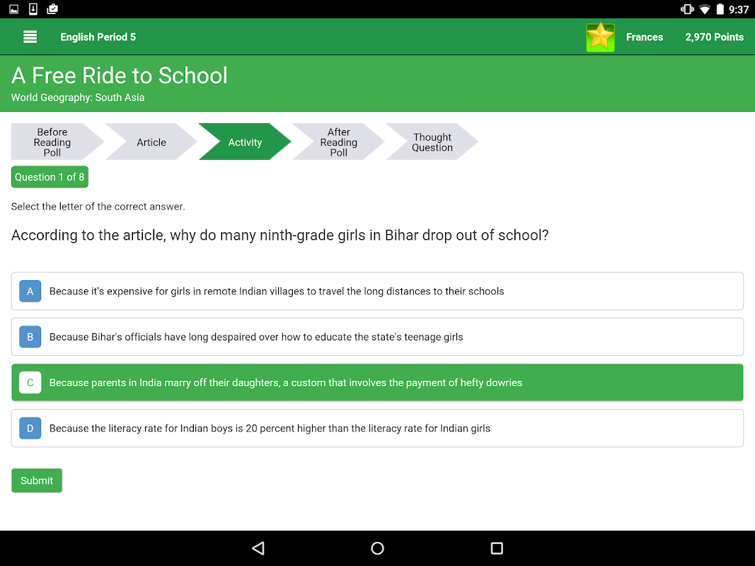 Der Einstieg ist einfach. Laden Sie einfach die App Achieve3000, melden Sie sich mit einem bestehenden Achieve3000 Benutzernamen und Kennwort, und wählen Sie Ihre Klasse.