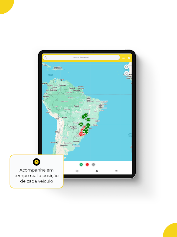 • Vollständige Liste der Trackables in Echtzeit, mit Standort, Adresse und Geschwindigkeit. Summiert und nach Status getrennt, sodass Sie erkennen können, welche davon online, offline, in Bewegung oder angehalten sind, bei eingeschalteter oder ausgeschalteter Zündung.