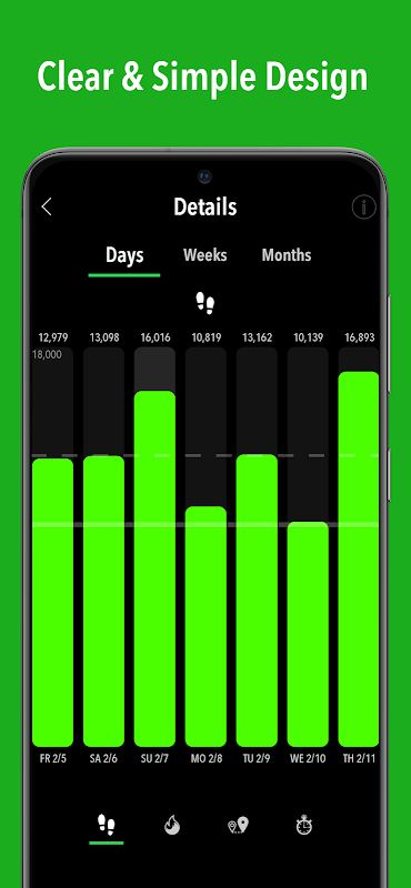 ActivityTracker wird deine Schritte, die Entfernung, deinen täglichen Kalorienverbrauch und deine aktive Zeit nachverfolgen. Die App kann es nur mit Hilfe deines Handys tun, das du überall mitträgst. ActivityTracker ist der Schrittzähler, den du schon bei dir die ganze Zeit hast.