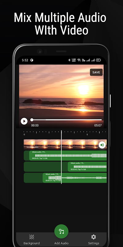 Audio zu Video hinzufügen geht beim Konvertieren von Audio in Video sehr schnell. Es kann innerhalb weniger Sekunden Audio zu Video hinzufügen. Wählen Sie eine Videodatei von Ihrem Telefon aus. Wählen Sie eine Audiodatei aus, um Audio mit Video zu mischen. Sie können Audio zuschneiden, bevor Sie Audio mit Video mischen. Nachdem Sie die Vorschau der Audiodatei ausgewählt haben, mischen Sie Musik mit Video. Sie können auch die Lautstärke der verschiedenen Audiospuren steuern, bevor Sie Audio mit Video mischen. Ursprünglich haben die Originalvideospur und die ausgewählte Audiospur 50-50 Bände. Sie können jedoch die Lautstärke dieser Spuren anpassen, um Audio und Video zu mischen.