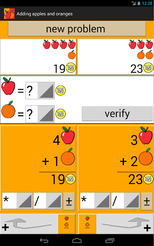 App kostenlos 'Äpfel und Orangen Hinzufügen', ist eine vereinfachte Version des ersten Teils der nummolt des bezahlten App: "Äpfel und Orangen 1 Dezimalstelle '. (Der Gauß-Jordan-Elimination)