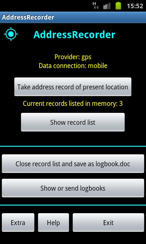 Press the "Take address record" button and a record will be saved containing: date and time, country, street, postal code and town details of your GPS location at that moment.