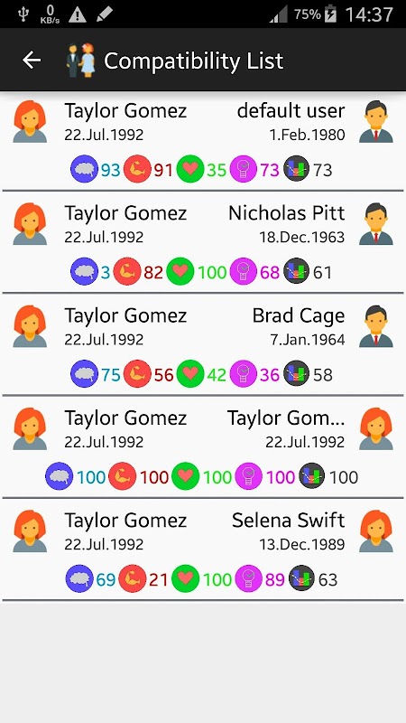 Schnell und einfach berechnen die biorhythmic Kompatibilität zwischen dem aktuellen ausgewählten Benutzer und die anderen Benutzer, die Sie in der Benutzerliste eingetragen haben.