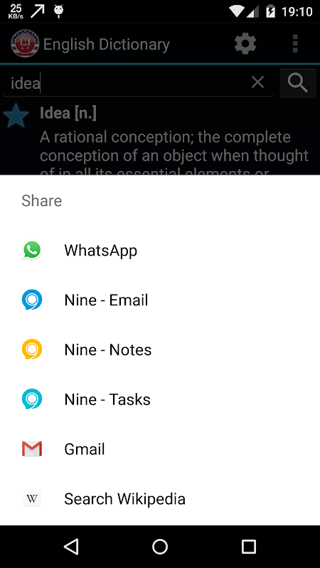 A: Drücken Sie einfach 2-3 Sekunden über die Übersetzung und Sie erhalten ein Menü mit allen verfügbaren Optionen zum Teilen im Wörterbuch, basierend auf den auf Ihrem Gerät installierten Apps (E-Mail, SMS usw.).