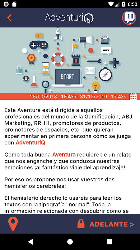 AdventurIQ es la plataforma tecnológica de gamificación creada por Aimtech Consulting, que permite crear dinámicas para dinamizar eventos gamificados, juegos de pistas, gincanas, street escapes, treasure hunting, scavenger hunting, e-learning, o conocer un territorio y culturizar jugando, en donde los participantes jugarán con esta app gratuita instalada en su móvil.