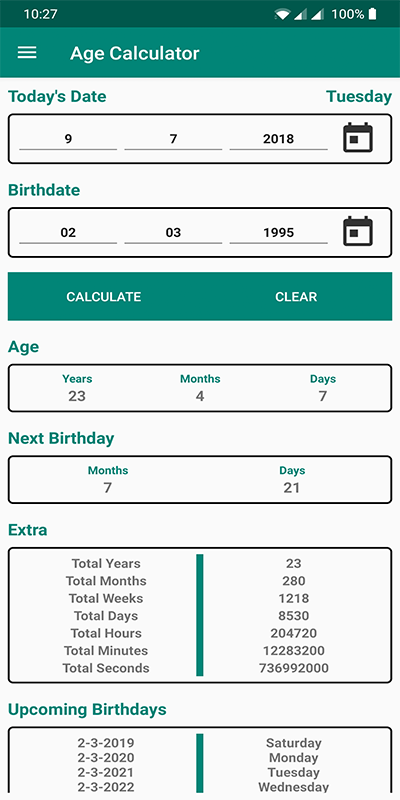 • Der Altersrechner berechnet das Alter in Jahren, Monaten, Wochen, Tagen, Stunden, Minuten und sogar in Sekunden.