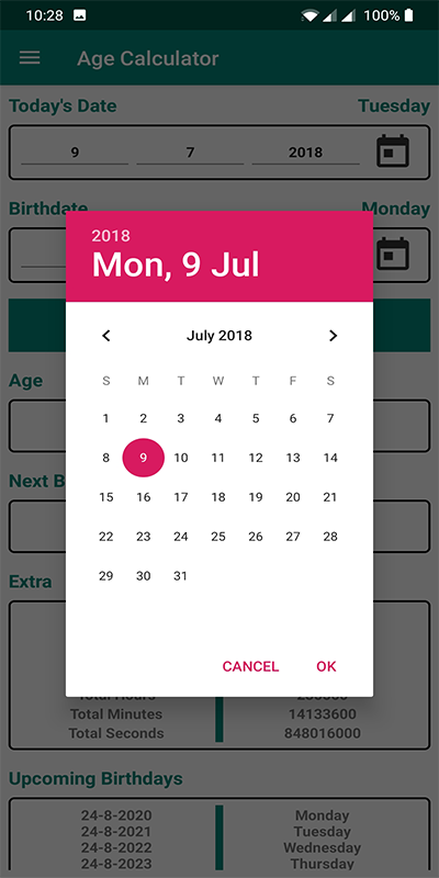 • Hier in dieser Altersberechnungs-App müssen Sie nur ein Geburtsdatum eingeben und die Altersberechnung berechnet das Alter in Jahr, Monat und Tagen.