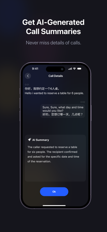 AI Call ist ein Live-Übersetzungstool für Reisende, Expats, Geschäftsleute und mehrsprachige Familien. Nutzen Sie es für internationale Anrufe oder die Kommunikation mit Menschen, deren Muttersprache Sie nicht sprechen – AI Call sorgt für klare, verständliche und präzise Gespräche.