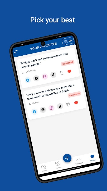 - Kreative und poetische Bildunterschriften: Greifen Sie auf einen umfangreichen Datensatz mit poetischen Zeilen und Zitaten renommierter Schriftsteller und Dichter zu. Verleihen Sie Ihren Beiträgen Eleganz und Kreativität mit von Literatur und Kunst inspirierten Bildunterschriften.