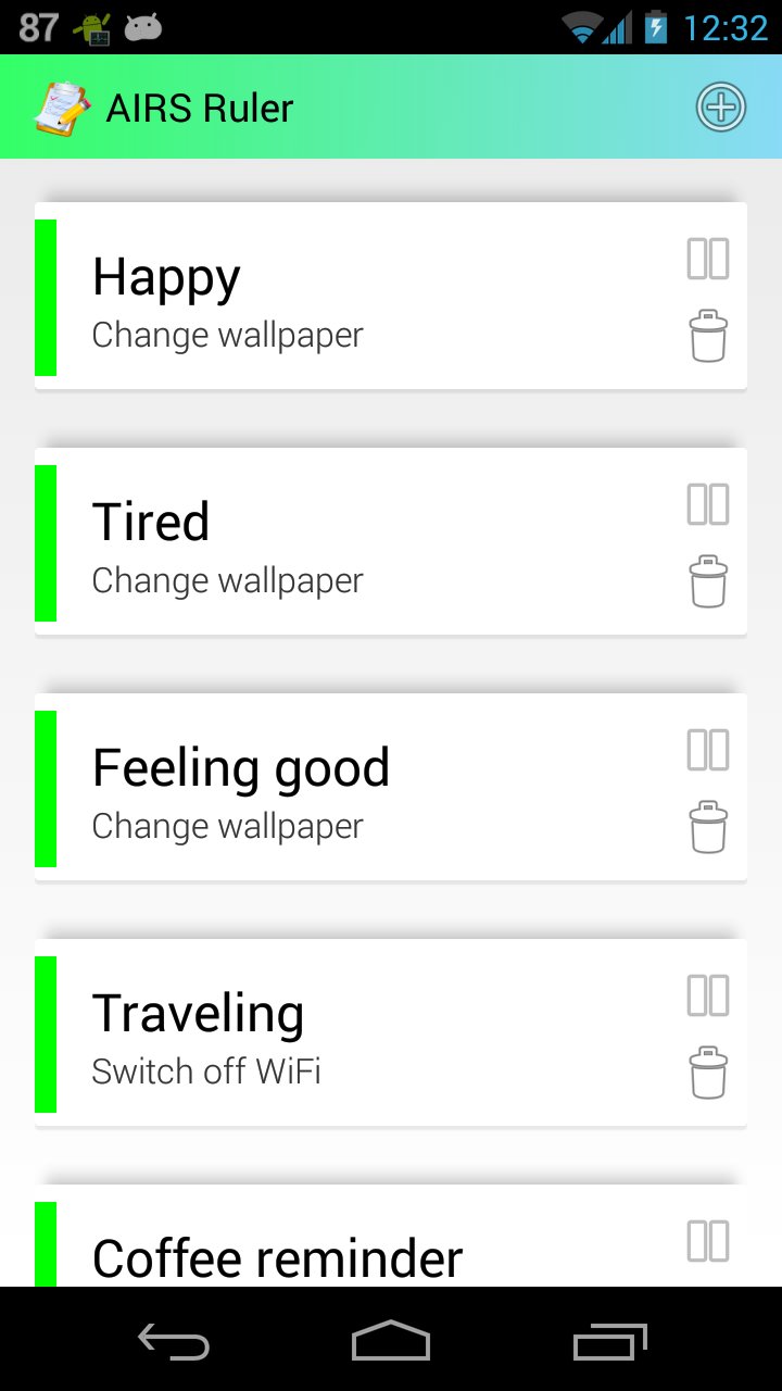 AIRS Ruler ermöglicht die Erstellung von Regeln, die Handyeinstellungen verändert aufgrund von Kontextwechseln die mit AIRS (https://play.google.com/store/apps/details?id=com.airs) oder <>Storica (https://play.google.com/store/apps/details?id=com.storica) erkannt werden.