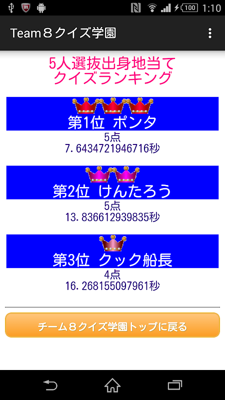 出身都道府県やニックネーム等を答える簡単なクイズですが、クイズ結果はアプリ内の全国ランキングに掲載されるので、正解数や解答時間を全国のTeam8ファンと競い合うことが出来ます。