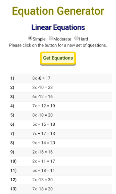 zufällig - Die App, Gleichung Generator kann eine Reihe von Fragen mit Antworten erstellen. Es ist ein No-Nonsense-App, die einfach zu bedienen ist, schlicht und einfach; Die Gleichungen können linear, gleichzeitige, quadratisch oder Simultan quadratisch sein. Sie können mit dieser App eine beliebige Anzahl von Fragensätze erstellen; Wiederholungen möglich sind; sie sind jedoch mit Hilfe eines speziellen Algorithmus auf einem Minimum gehalten.