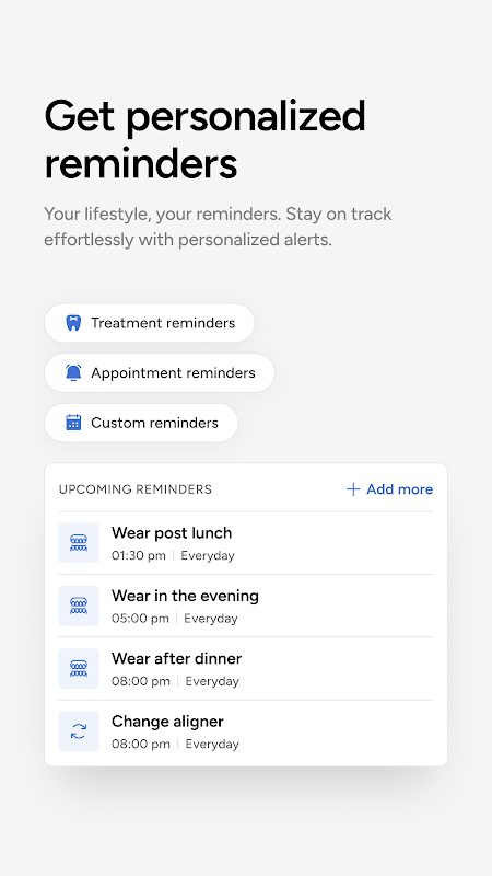 Mit unserer App erhalten Sie personalisierte Erinnerungen zum Wechseln Ihrer Aligner gemäß Ihrem Behandlungsplan, sodass Sie für einen reibungslosen Behandlungsverlauf auf dem Laufenden bleiben.