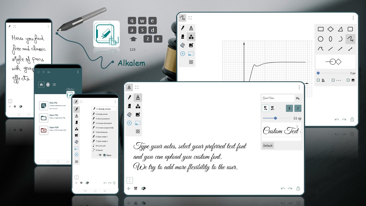 Alkalem ist ein Dokumenteneditor mit verschiedenen Tools. Hier finden Sie klassische Stifte mit einigen grafischen Effekten. Wenn Sie lieber Absätze eingeben, finden Sie hier eine Liste mit tollen Schriftarten, die Sie durch das Hochladen externer Schriftarten, wie in der App angegeben, bereichern können. Sie können den Hintergrund ändern, einige geometrische Formen hinzufügen, Bilder hinzufügen ...