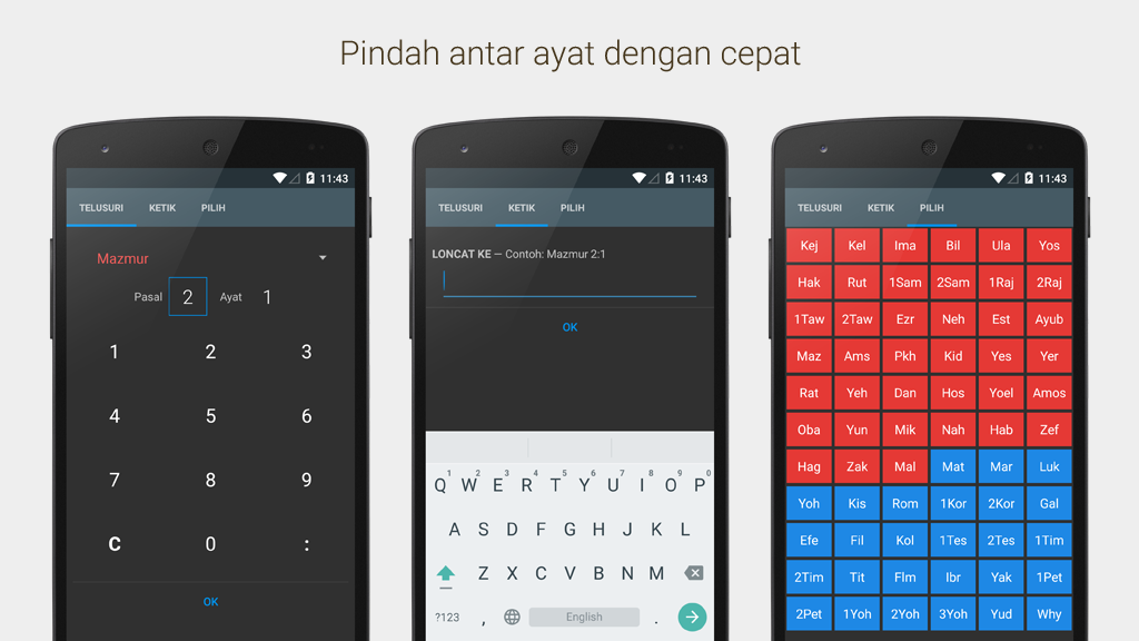 Verschiedene Übersetzungen der Bibel. Es gibt verschiedene Versionen von Bibelübersetzungen in Indonesisch und regionalen/ethnischen Sprachen, der Originalsprache der Bibel (Griechisch/Hebräisch) und anderen Fremdsprachen. Es muss nur einmal heruntergeladen werden, danach kann es offline gelesen werden.