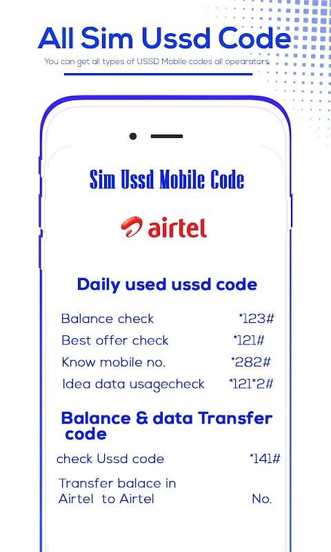 All Network USSD Codes App will help to find out the USSD Mobile Codes for All Mobile operators in India. Also this application can works without internet so you can access all USSD codes even if you are not connected to the internet.