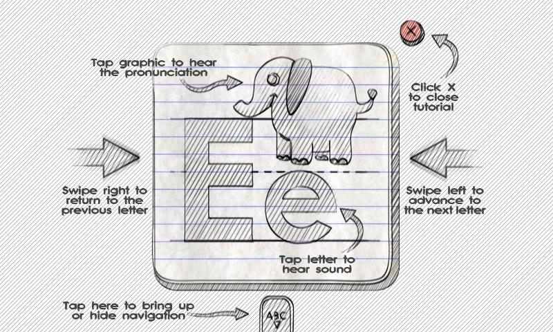 Tap the letter to hear its pronunciation. Tap the animated object to hear that letter used in context.