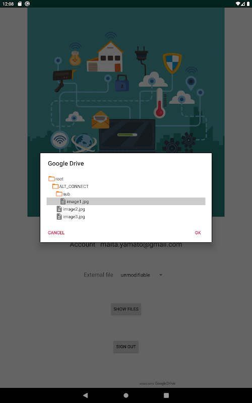 ALT CONNECT is an application for browsing files of Google Drive™. It has the features to list files in a tree, refer to file meta information, create a new folder and rename, move, copy, delete, trash files. You can upload files to Drive by sharing them with other file-browsing applications. The contents can be displayed on the phone by downloading the file from Drive and caching it. It can’t edit files directly on the Drive.