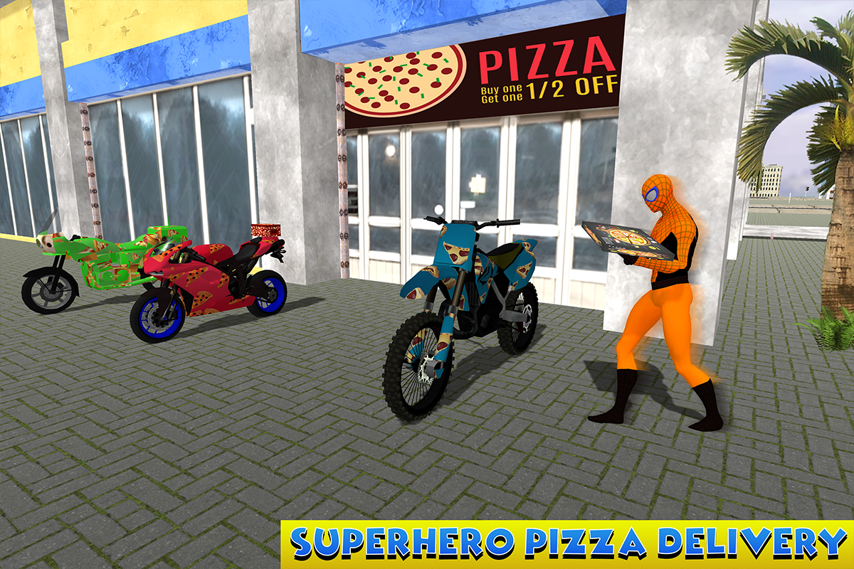 Incredible Spider pizza delivery is an adventurous and thrilling game. Pizza delivery from incredible hero is hard job because spider hero never took the role as pizza delivery boy. This spider pizza delivery bike is designed for the lovers who want to play the role of spider hero pizza delivery boy. We are providing you a chance to be a fantastic spider pizza boy in pizza delivery game. This delivery duty is tough and also a challenging job with advanced sports bike pizza delivery. In this simulator drive super spider bike to complete pizza deliveries in time that you have never seen before in any other pizza delivery games. You deliver pizza in different areas like home, school, building and offices. Pizza delivery game is full of fun and thrilling environments. Challenging missions are waiting for you.