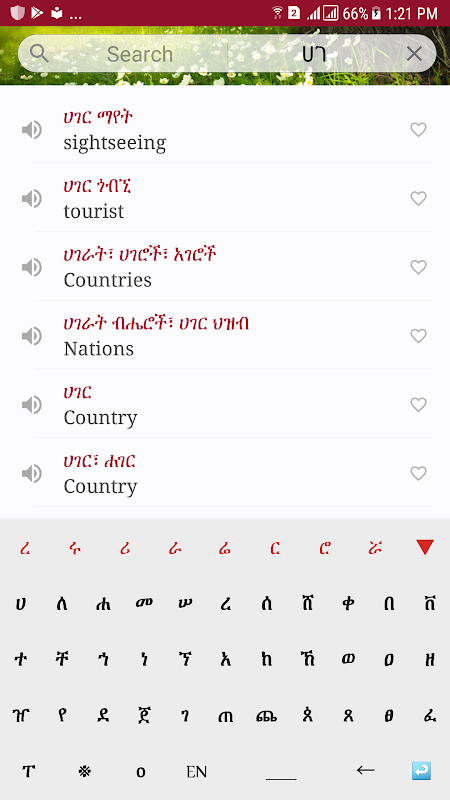 Englisches Amharisch Wörterbuch (Amharisch - Englisches Wörterbuch) mit vielen nützlichen Funktionen. Mit diesem Amharisch (äthiopisch) Wörterbuch können Sie Wörter zu Ihren Favoriten hinzufügen, um sie leicht zu erlernen.