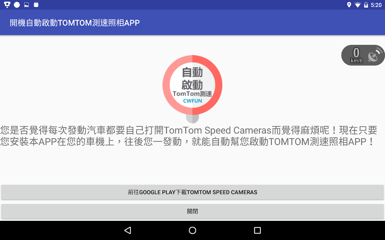 您是否覺得每次發動汽車都要自己打開TomTom Speed Cameras而覺得麻煩呢!現在只要您安裝本APP在您的車機上,往後您一發動,就能自動幫您啟動TOMTOM測速照相APP!