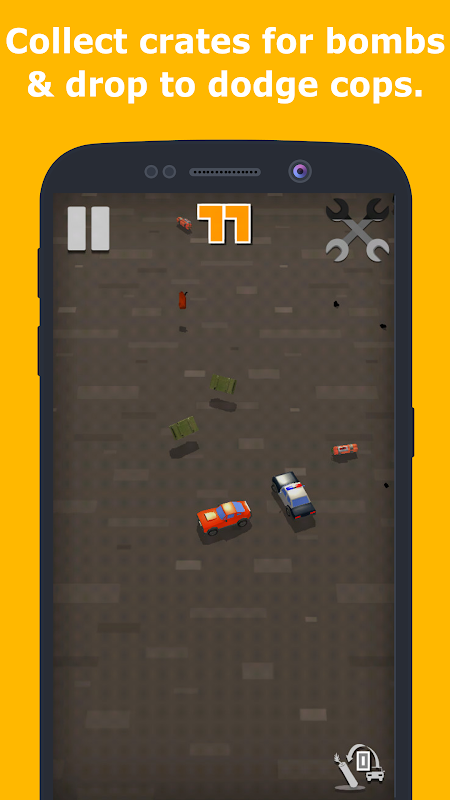 Sammle Kisten für Bomben und wirf Bomben ab, um den Polizisten auszuweichen, die dein Auto verfolgen. Sammle Reifen und Tanks, um dein Auto zu reparieren. Mit einem Schraubenschlüssel kannst du dein Auto komplett reparieren.