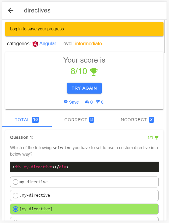 💾 Speichern Sie Ihre Lieblingsquizze für einen einfachen Zugriff und behalten Sie den Überblick über Ihren Fortschritt. Überprüfen und vertiefen Sie Ihre Angular-Kenntnisse jederzeit.