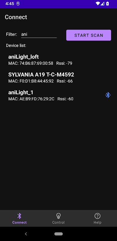 Gehen Sie zur Registerkarte VERBINDEN, um das aniLight v1-Gerät mit dem Namen „aniLight_1“ zu scannen und zu finden. Tippen Sie darauf, um die Verbindung herzustellen oder zu trennen.