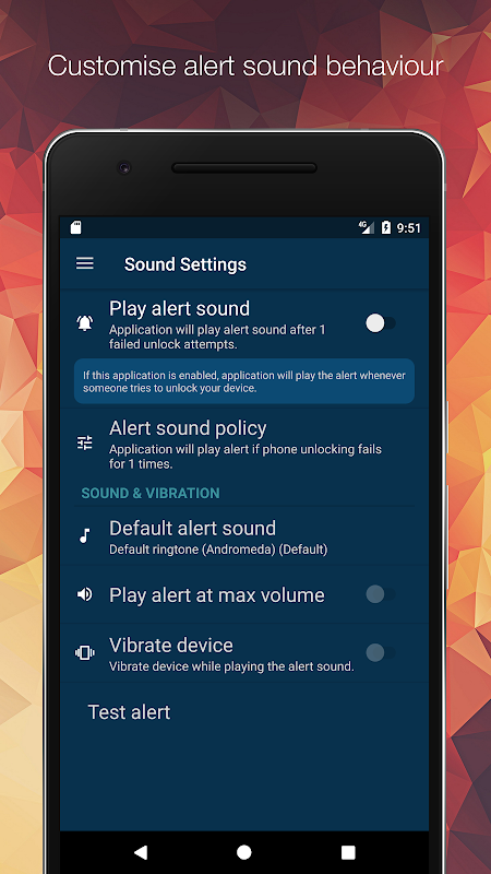 • Anti-Theft Alarm: You can set an alert buzzer, that will ring the phone when someone enters wrong password/pin/pattern to access your device on the lock screen.