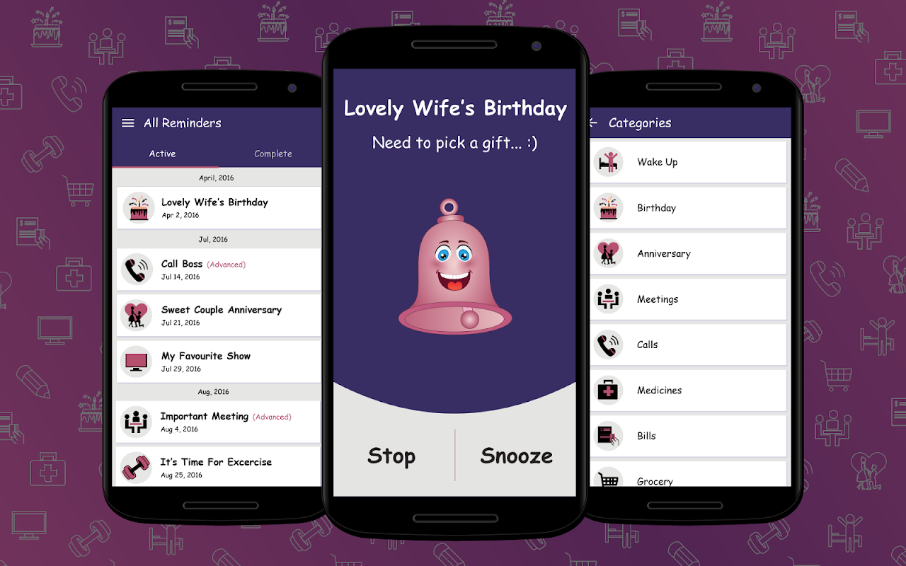 Jede Erinnerung hilft Ihnen Erinnerungen schnell eingestellt. Es erinnert an bestimmten Zeit alles. Jede Erinnerung hat Eigenschaft der Wiederholungsintervall wie Wiederholung alle paar Stunden, Tage, Wochen, Monate, Jahre, bestimmte Tage und viele mehr. Es bietet im Voraus Warnungen für alle Mahnungen.