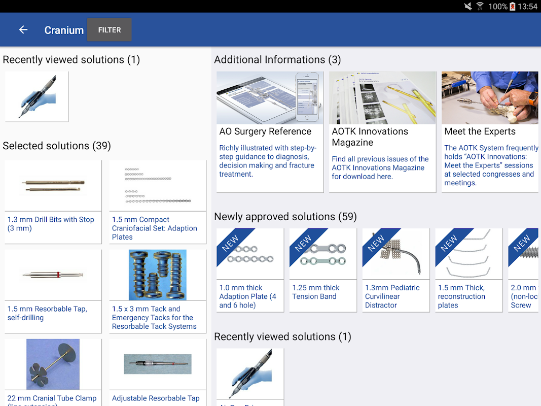 The AO TC Approved Solutions App is an information tool for healthcare professionals and engineers interested in new surgical solutions in the clinical areas of Trauma, CMF, Spine, Veterinary and Neurosurgery. It allows users to browse surgical products and technologies that have been approved by the AO TC System.