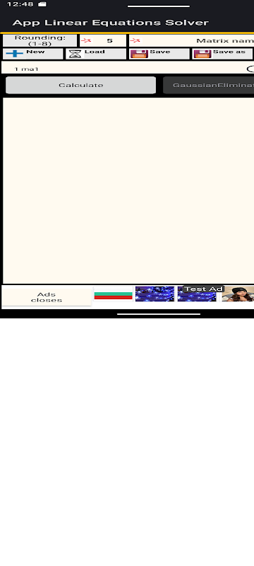 Die Anwendung verfügt über Funktionen zum Erstellen, Speichern, Löschen und Sichern der erweiterten Matrizen unter einem neuen Namen. Jede Matrix wird unter einem eigenen Namen gespeichert. Die Liste der erweiterten Matrizen wird in einer Dropdown-Liste angezeigt. Nach Auswahl eines Elements wird eine Schaltfläche zur Berechnung der Lösung des entsprechenden linearen Systems angezeigt. Die Lösung wird in einer Tabelle angezeigt. Nach der Berechnung der Lösung gibt es auch eine Funktion zur Anzeige der Gauß-Jordan-Eliminationsmatrix. Alle Gleichungsmatrizen, Lösungen und Eliminationsmatrizen können in einer Datei im ausgewählten Geräteverzeichnis gespeichert werden.