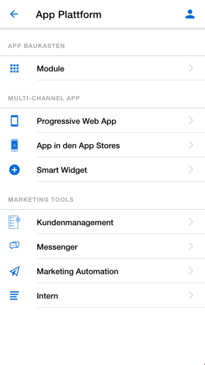 Mit der eigenen App für Dein Business und unseren Tools wie Messenger, Kundenmanagement und Marketing Automation machst Du Dein Geschäft online noch erfolgreicher. In unserer Showroom App kannst Du alle Module des App Baukastens vorab testen und weitere Informationen über unsere Plattform finden.