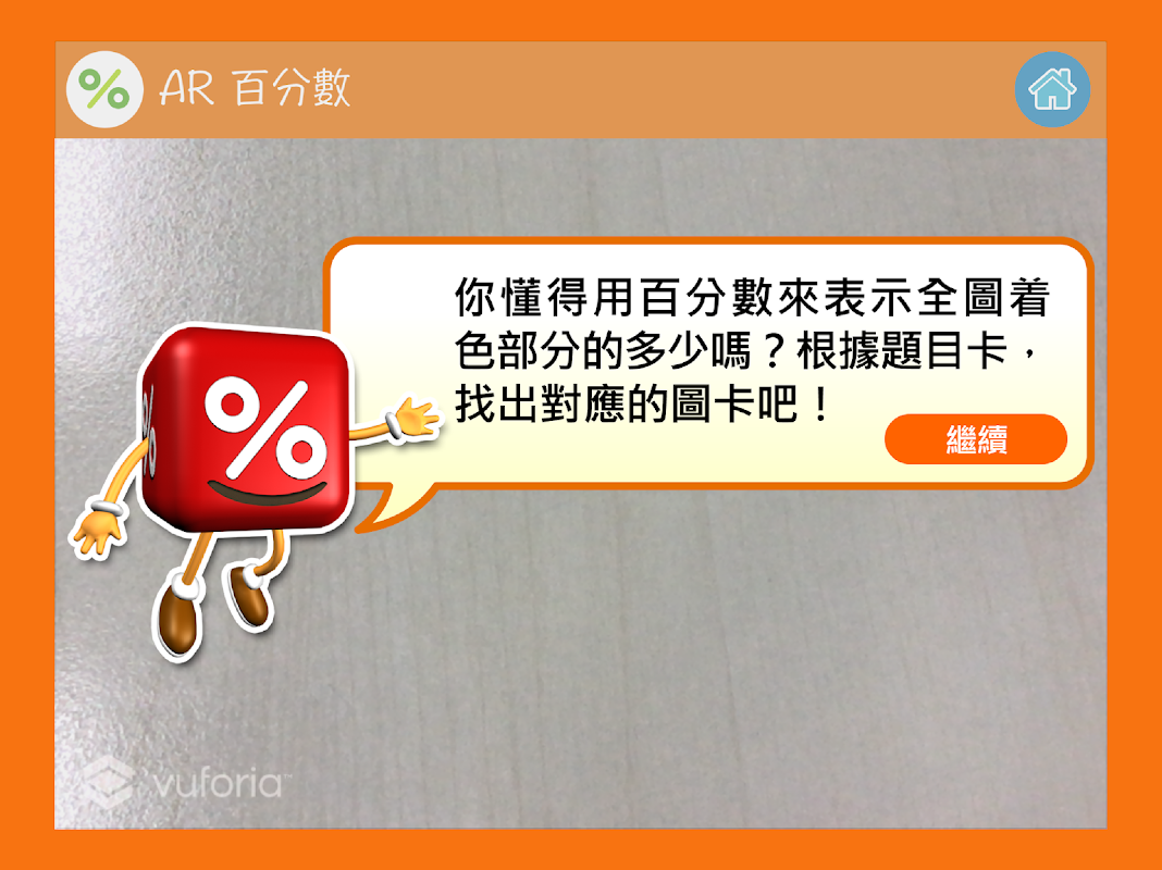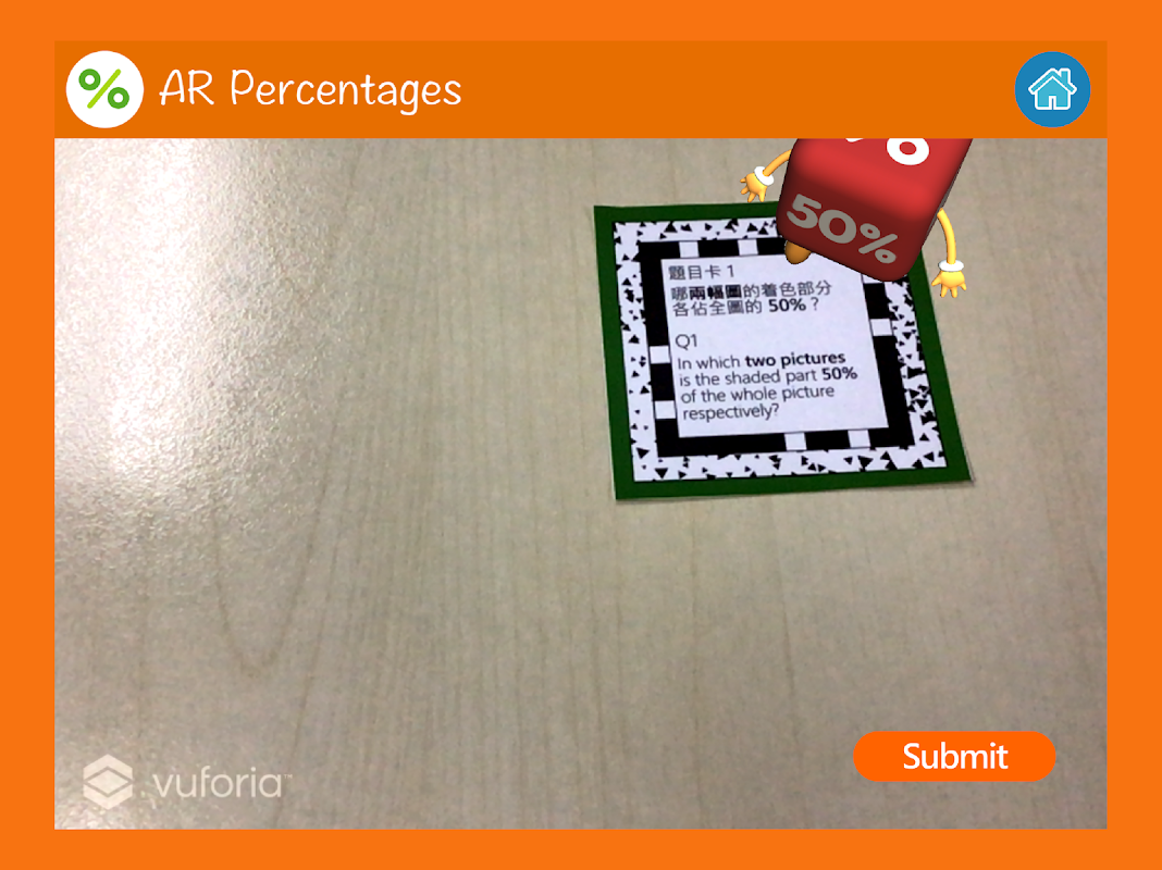 使用應用程式時需要配合AR 百分數的認識專屬的AR 活動卡使用,透過將正確的問題卡及答案卡配對來增強同學對百分數的辨別能力。務求做到幫助老師教學的同時,亦能夠滿足讓學生在家中自學的需要。