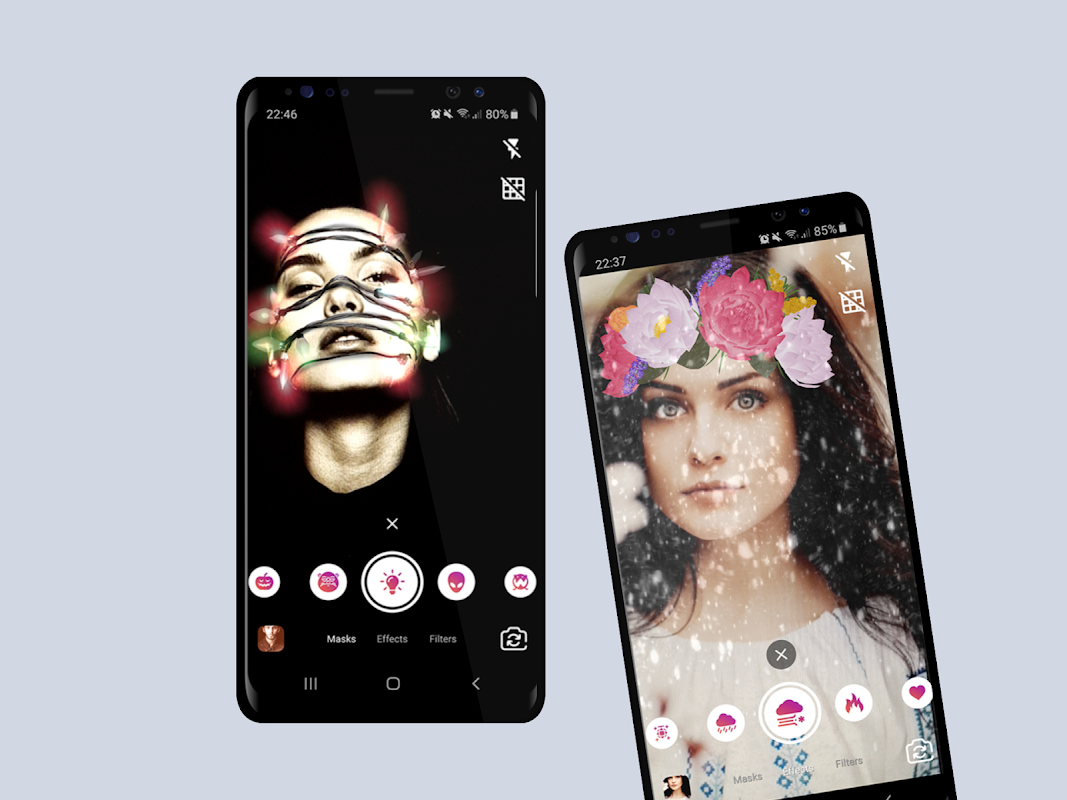 Machen Sie Fotos oder nehmen Sie Videos mit einer Vielzahl von Echtzeit-AR-Masken, Filtern und Effekten auf – egal, ob Sie Ihr Gesicht mit animierten Masken verwandeln, dynamische Effekte wie Feuer und Regen hinzufügen oder Ihren Look mit stilvollen Filtern wie VHS und Manga verbessern.