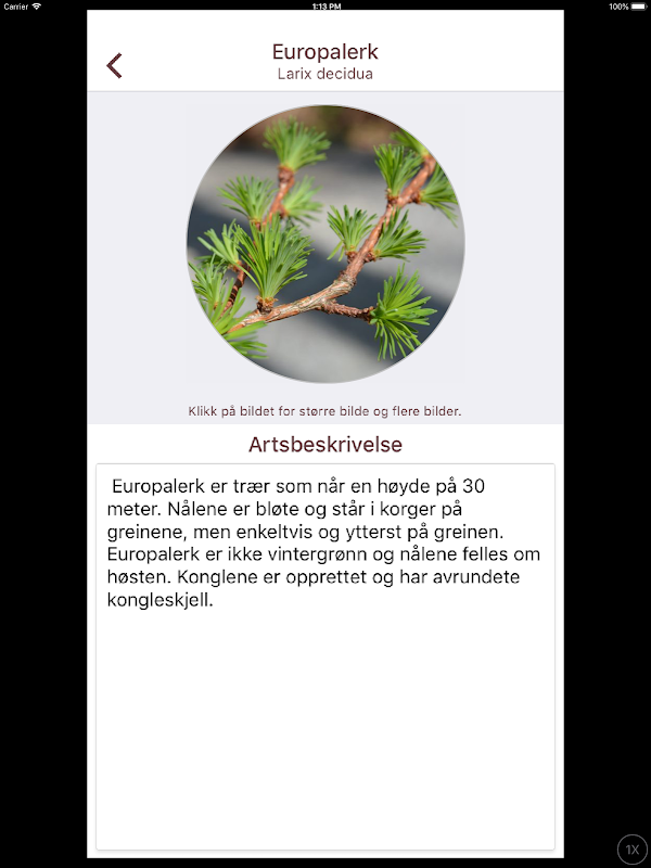 Appen inneholder en identifikasjonsnøkkel. Med identifikasjonesnøkkelen i appen kan du finne fram til trær som naturlig hører hjemme i Norge pluss noen av de vanligste innførte artene. Denne nøkkelen er hovedsakelig beregnet for bruk i vekstsesongen, hvor man har tilgang til blader, blomster og frukt. Identifikasjonsnøkkelen mangler fortsatt litt bilder, men dette vil kommer når bladene har sprunge ut.