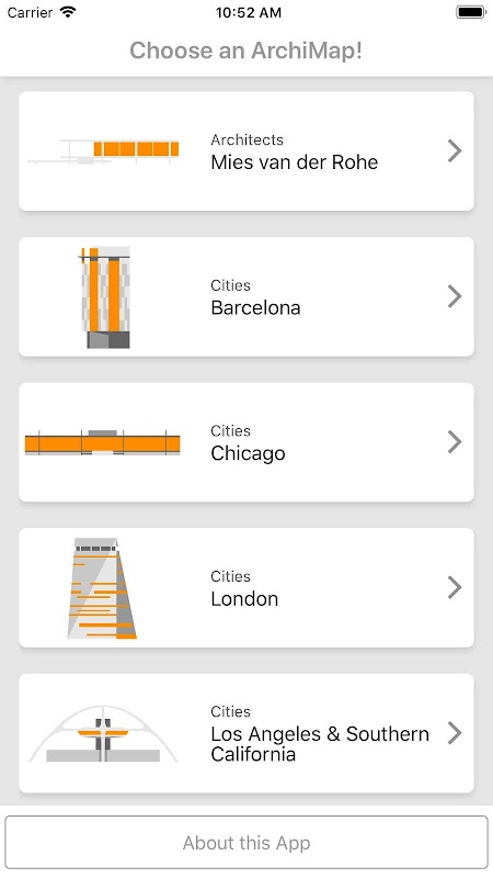 ArchiMaps verfügt über zwei Hauptnavigationsmodi: Karte und Liste. Mit Map können Sie Architekturwerke nach ihrem geografischen Standort durchsuchen und mit Ihrer eigenen Position verknüpfen. Liste zeigt Gebäude sortiert nach Nähe, Datum oder alphabetisch. Von beiden aus können Sie auf einen Informationsbildschirm für jede Architekturarbeit zugreifen.