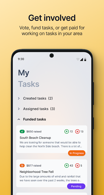 Die Nachbarn stimmen über die Aufgaben ab, die am wichtigsten sind, um bei der Priorisierung der zu erledigenden Arbeit zu helfen, und sie können eine Aufgabe auch unterstützen, indem sie ihr Geld hinzufügen. Andere Nachbarn können dann entscheiden, an diesen Aufgaben zu arbeiten und den gesammelten Betrag bezahlt zu bekommen.