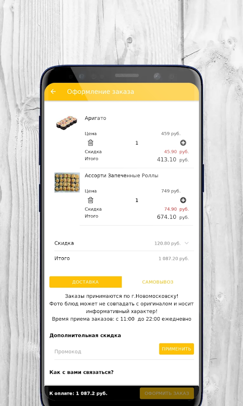 Frisches Gemüse, richtiges Fleisch, ehrlicher Fisch! Wir bereiten für Sie vor und liefern Ihre Bestellung schnell zu Ihnen nach Hause und ins Büro! Bestellen Sie schnell und bequem mit unserer mobilen Anwendung „ARIGATO“. Auf der Speisekarte stehen verschiedene Sushi und Brötchen, saftige Pizza, Nudeln und andere leckere Gerichte! Bei der Bestellung über die mobile Anwendung gibt es profitable Aktionen und Rabatte!