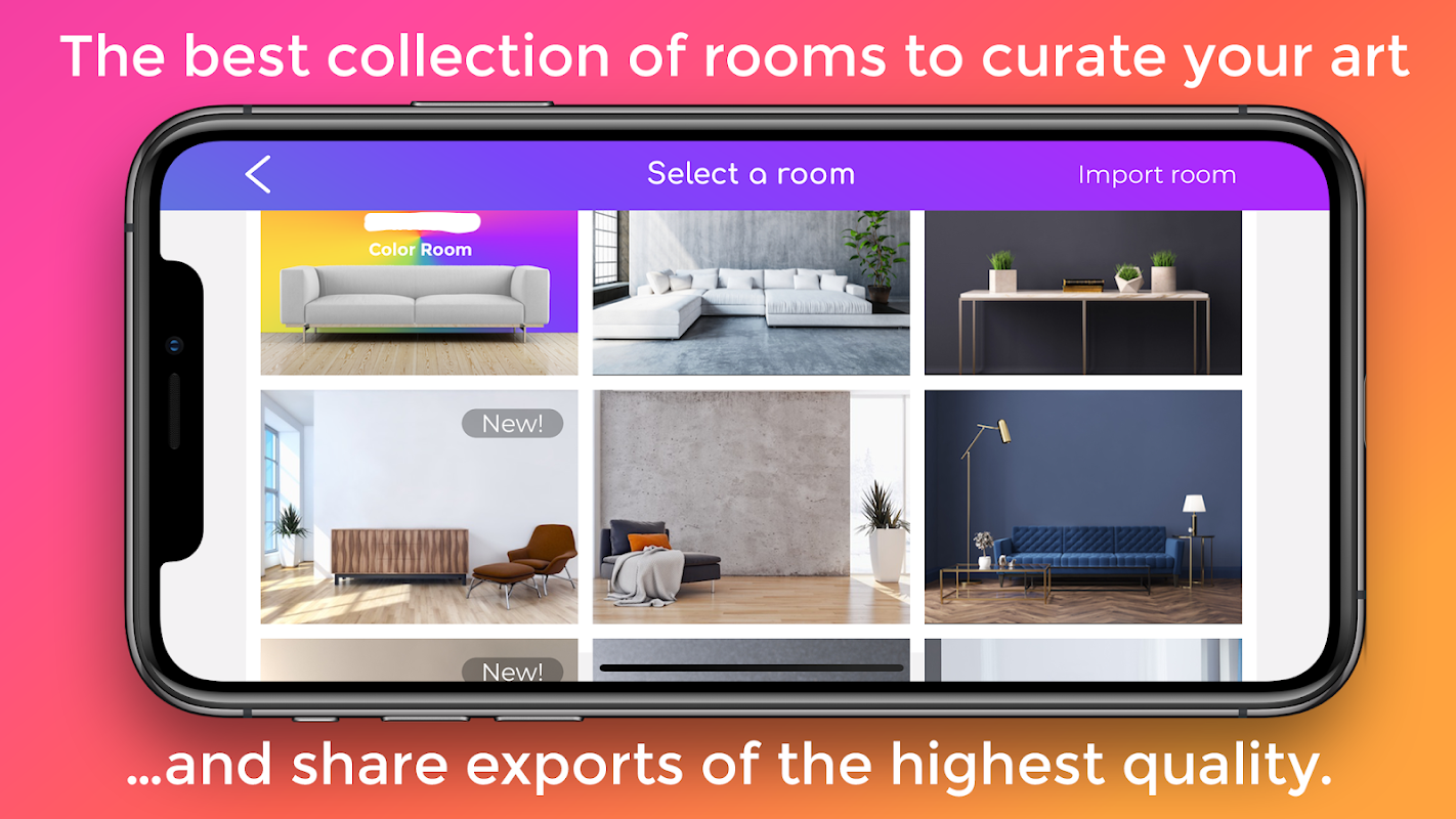 Stets aktuelle Räume und Exporte in höchster Qualität. Kuratieren ist ein Kinderspiel. Sparen Sie sich stundenlanges Photoshop-Arbeiten und sorgen Sie dafür, dass Ihre Kunst immer fantastisch aussieht.