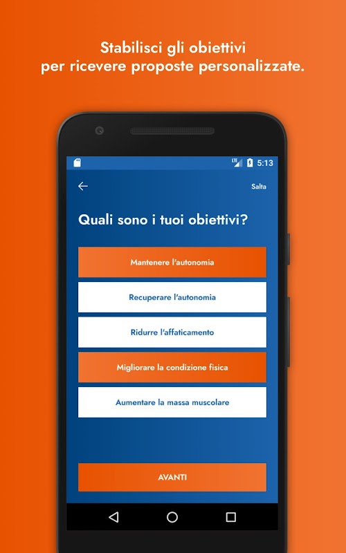 L’utente attraverso la registrazione iniziale ha modo di effettuare un test di base per stabilire obiettivi, forma fisica, discipline e provincia geografica di riferimento.