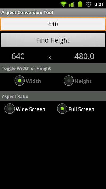 A tool to help with resizing videos and photos. Use the default Widescreen or Full-Screen ratio values or enter your own custom ratio under the settings. Don't know the ratio value you need? Use the ratio calculator under settings; enter the width and height of your aspect and click calculate to find the ratio. Try using the width and height values of your phones screen (ie: 854 x 480) and see what ratio it is.