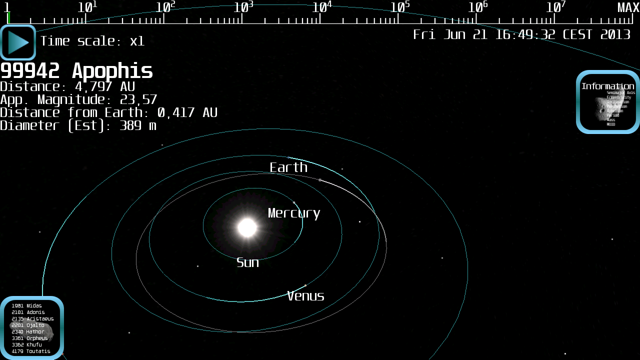 Diese App simuliert die Flugbahnen der Asteroiden in der Nähe, die möglicherweise gefährlich für die Erde sind. Sie können in Echtzeit zu sehen, wo sie waren, oder wird zu einem bestimmten Zeitpunkt sein.