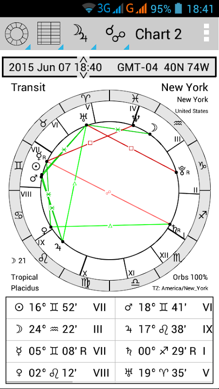 Das Diagramm kann durch die Bewegung entlang seines Radius gestreckt werden. Berühren Sie den Planeten, das Hauszeichen oder die Aspektlinie, um die Informationen darüber anzuzeigen (Zeitpunkt des genauen Aspekts, Eintritte von Planeten, Aspekte zu den Hausspitzen). Doppelklick erlaubt, zum Zeitpunkt des Eintrags/genau zu gehen und die Interpretation im Internet zu suchen.