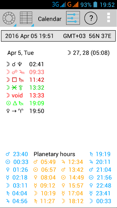 - Kalender der Aspekte und Eingriffe für den Zeitraum von 1 Tag, 1 Woche, 1 Monat. Es funktioniert auch für Richtungen und Progressionen.