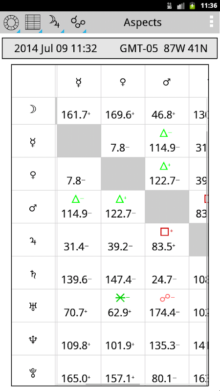 - Eintritte von Planeten, Zeit der genauen Aspekte (berühre das Planetenzeichen oder die Aspektlinie);