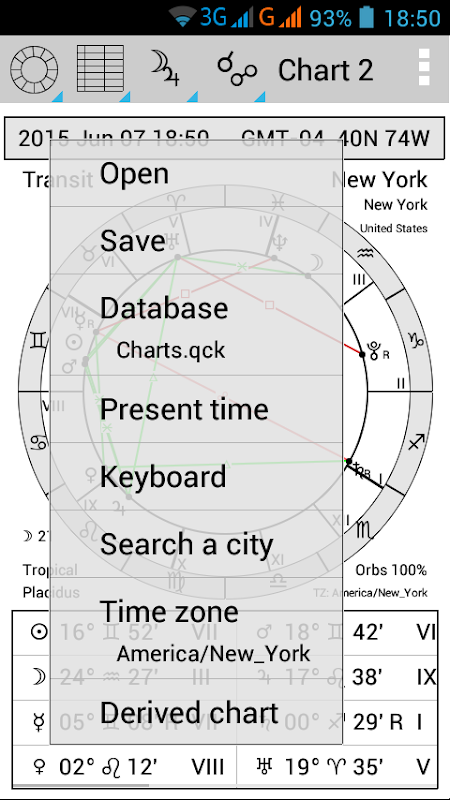 Zeit und Ort des Diagramms können jederzeit leicht geändert werden: Klicken Sie auf die Zeitleiste, danach ändern vertikale Bewegungen entlang des Bildschirms das Datum oder den Ort, horizontale Bewegungen wählen das zu ändernde Element (Jahr, Monat, Koordinaten usw.) aus . Doppelklicken Sie auf die Zeitleiste, um ein Menü anzuzeigen, mit dem Sie Karten speichern und öffnen, die Tastatur zur Eingabe von Zeit und Koordinaten anzeigen, die Koordinaten einer Stadt im Internet suchen, die Zeitzone und die aktuelle Datenbank auswählen können.