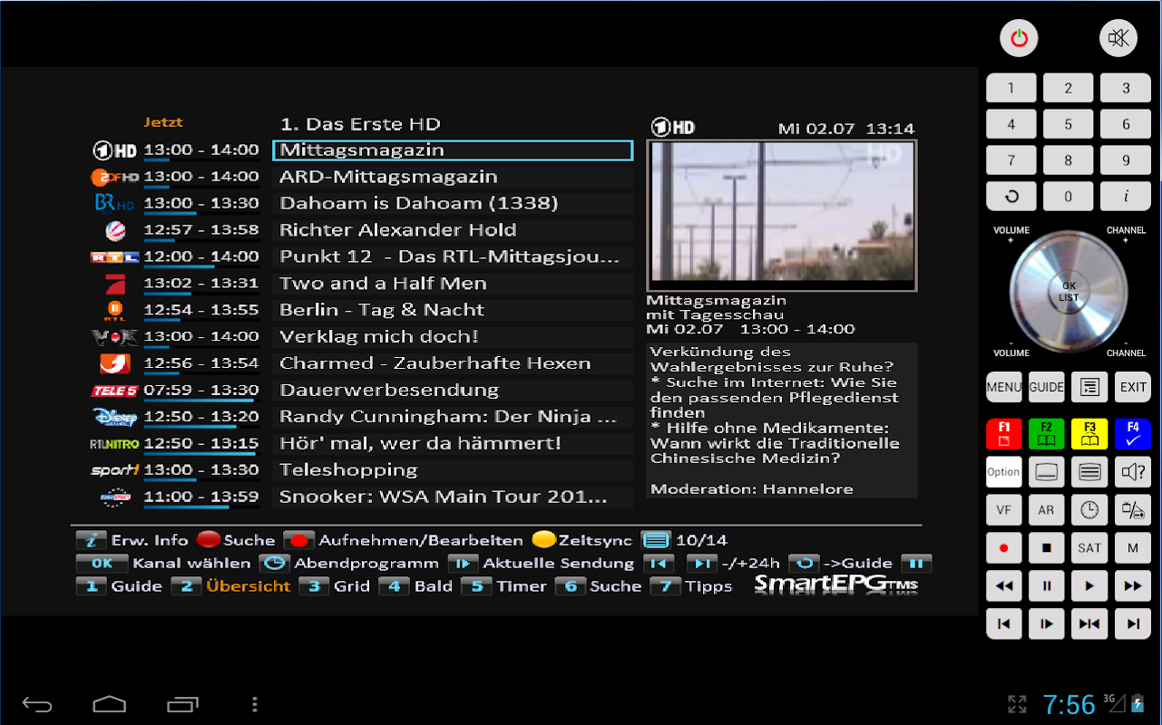 Mit aTMSremote ist es möglich den PVR aus der Ferne zu bedienen. Die vom TAP "TMSRemote" gelieferte Anzeige der Bedienoberfläche des PVRs (OSD) wird von aTMSremote live dargestellt. Somit hat man eine direkte Rückmeldung, wenn Befehle über die virtuelle Fernbedienung gesendet werden.