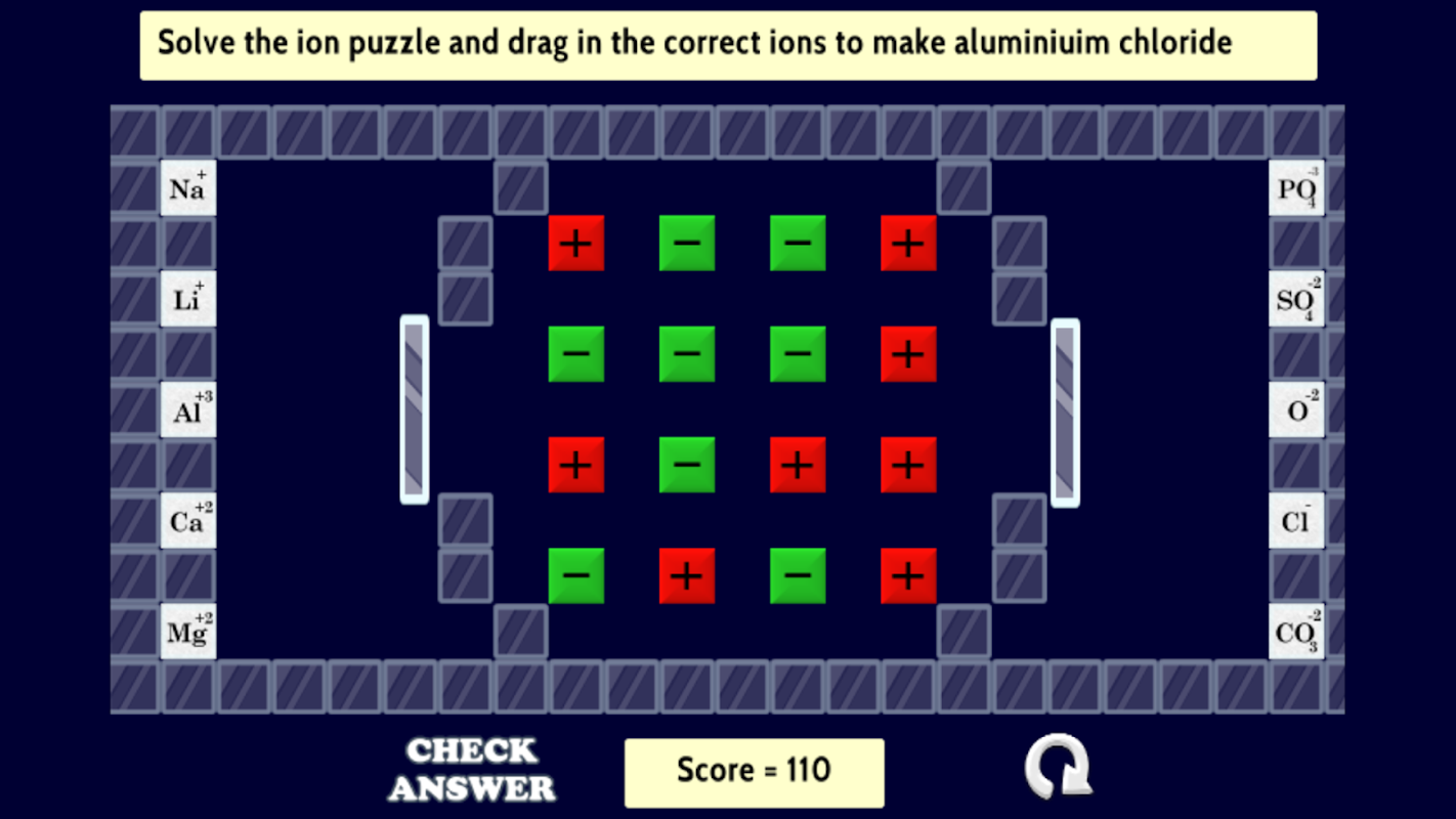 Das Spiel zeigt außerdem, wie ionische Verbindungen durch die Kombination von Kationen und Anionen gebildet werden, sodass die elektrische Neutralität erhalten bleibt.